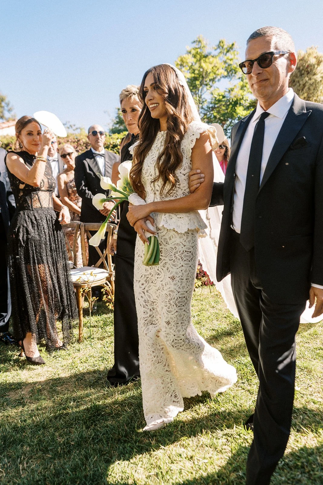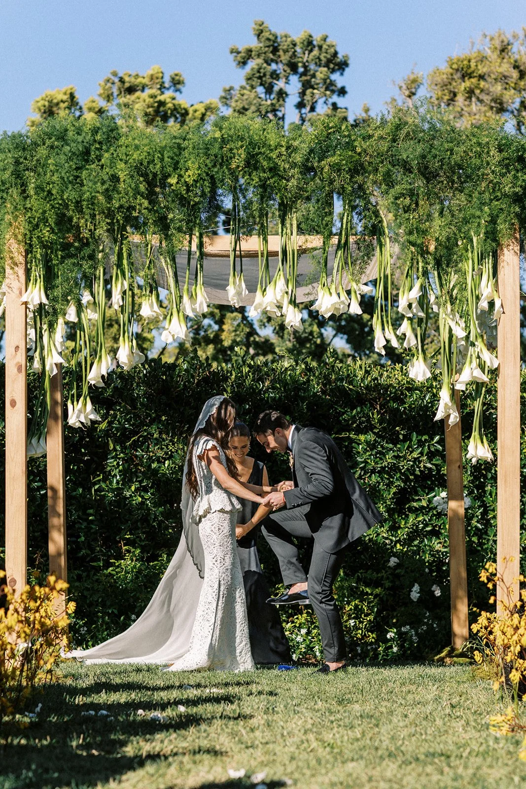 the ceremony chuppah was adorned in long calla lilies that graced the front and sides like floral curtains, with green vines draping over the top. our original plan had been to line the aisle with yellow dill to create the feeling of a whimsical but architectural meadow. after a site visit, we noticed yellow kangaroo paw all around the property and proposed a switch from dill to kangaroo paw for a more cohesive and immersive visual experience. the end result situated the chuppah install perfectly within its surroundings.