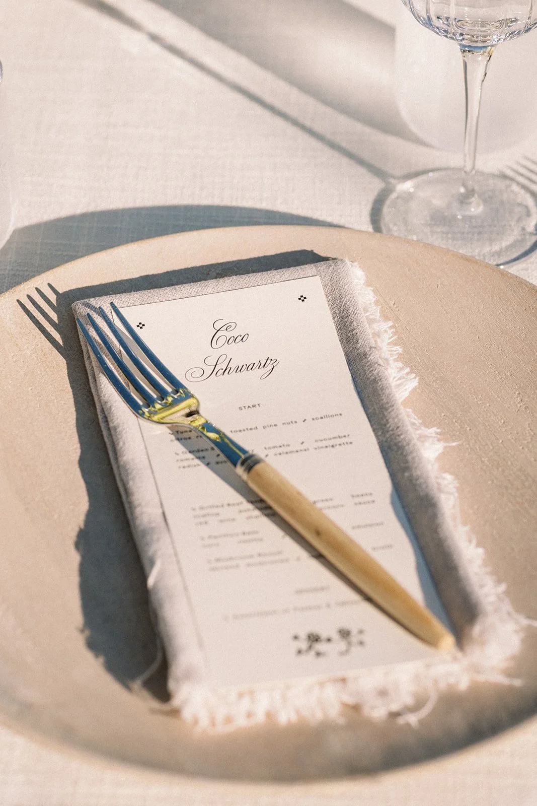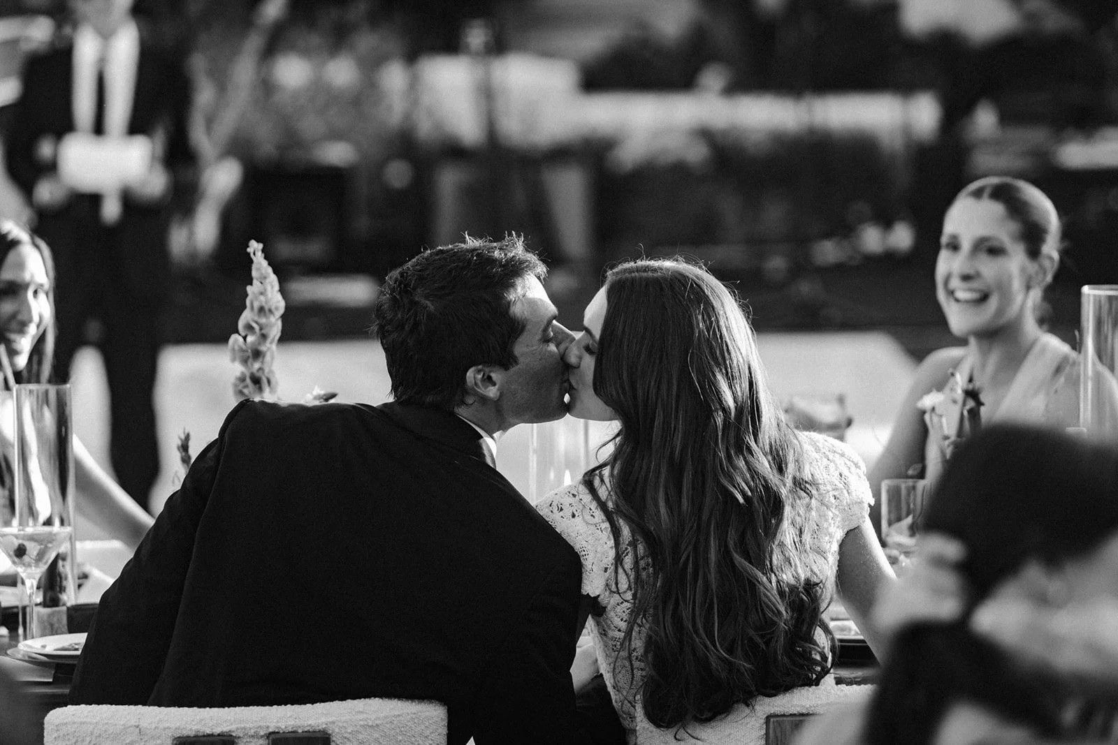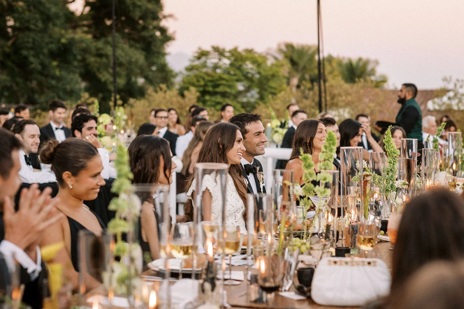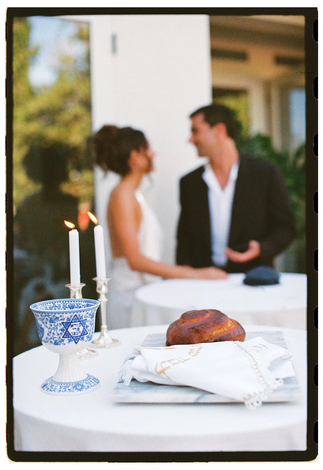 for reception, we sourced decor that further told their story in clean lines and organic materials—silver aluminum vases, hand-molded in studio; stacks of white travertine on the tables; specially sourced travertine candle holders in earthy shades of ecru and sand. every detail was thoughtfully crafted and considered as a whole, down to the colors of the candles (olive green taper candles and ribbed sage green pillar candles).