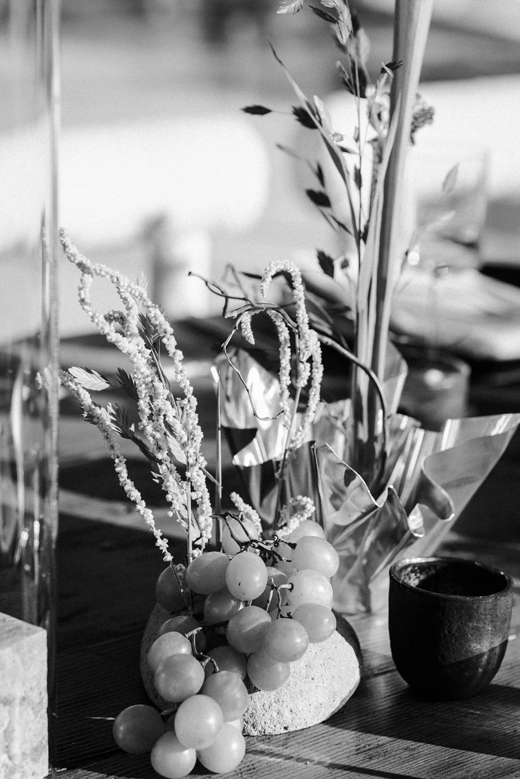 In our early conversations with Alex and Noah, they talked about their love for mushroom foraging, so we knew we wanted to fold that into the design of their wedding day. we incorporated locally grown oyster mushrooms into their florals as well as other funky natural elements like pitcher plants, moss, and stone frogs. with the added elegance of white calla lilies and green grapes, the florals told a story unique to the couple: elegant but eclectic, sleek but organic, clean… but not afraid to get a little dirty.