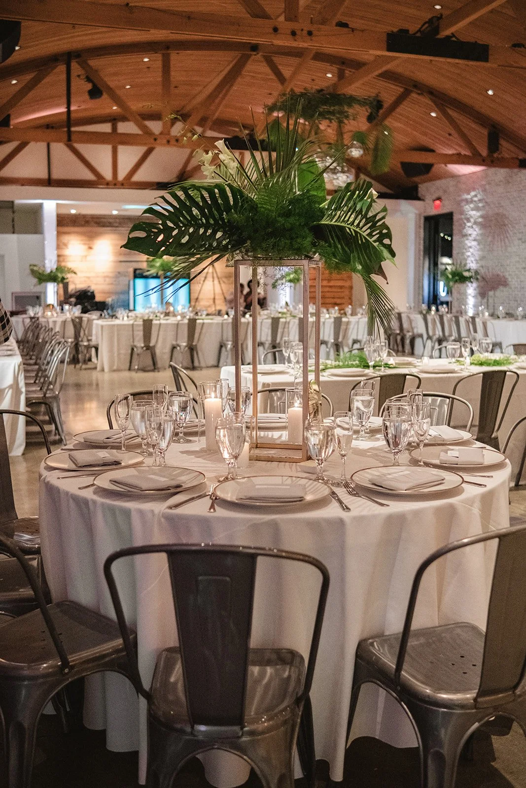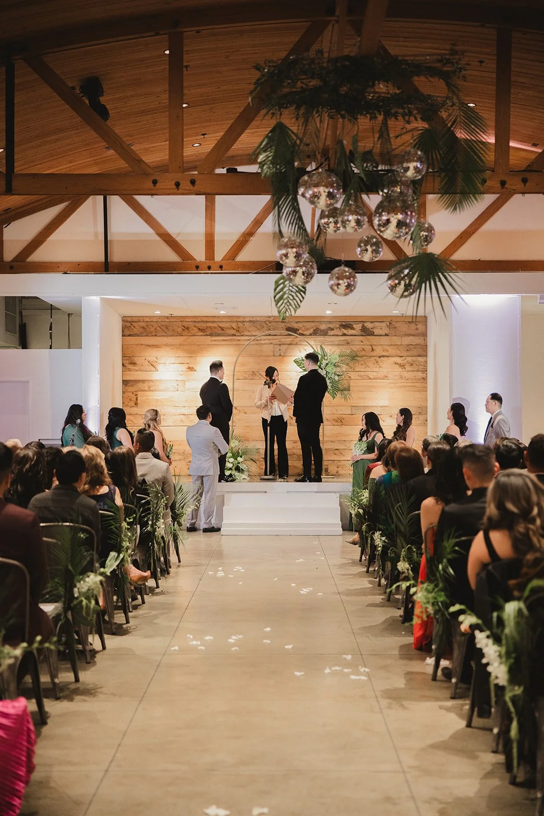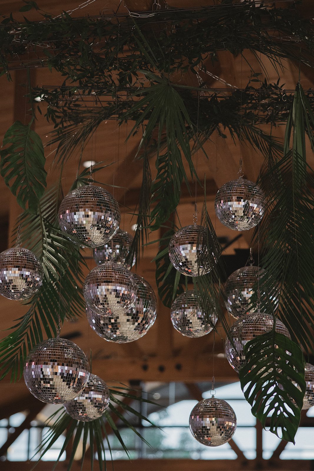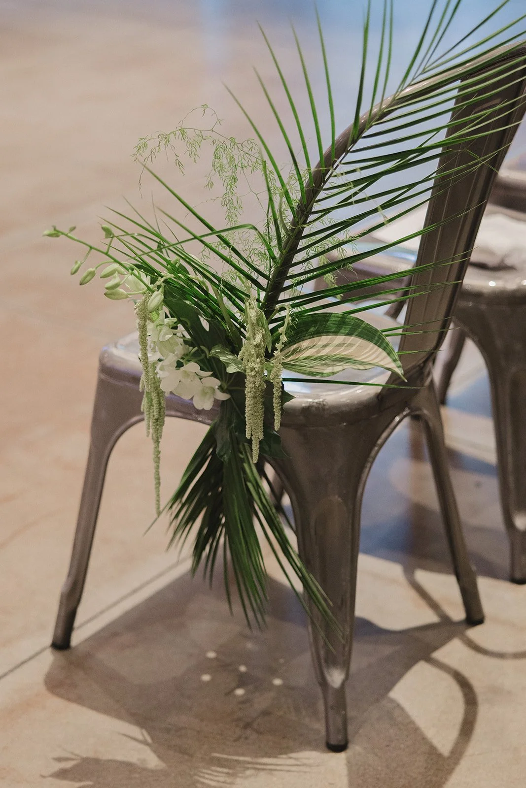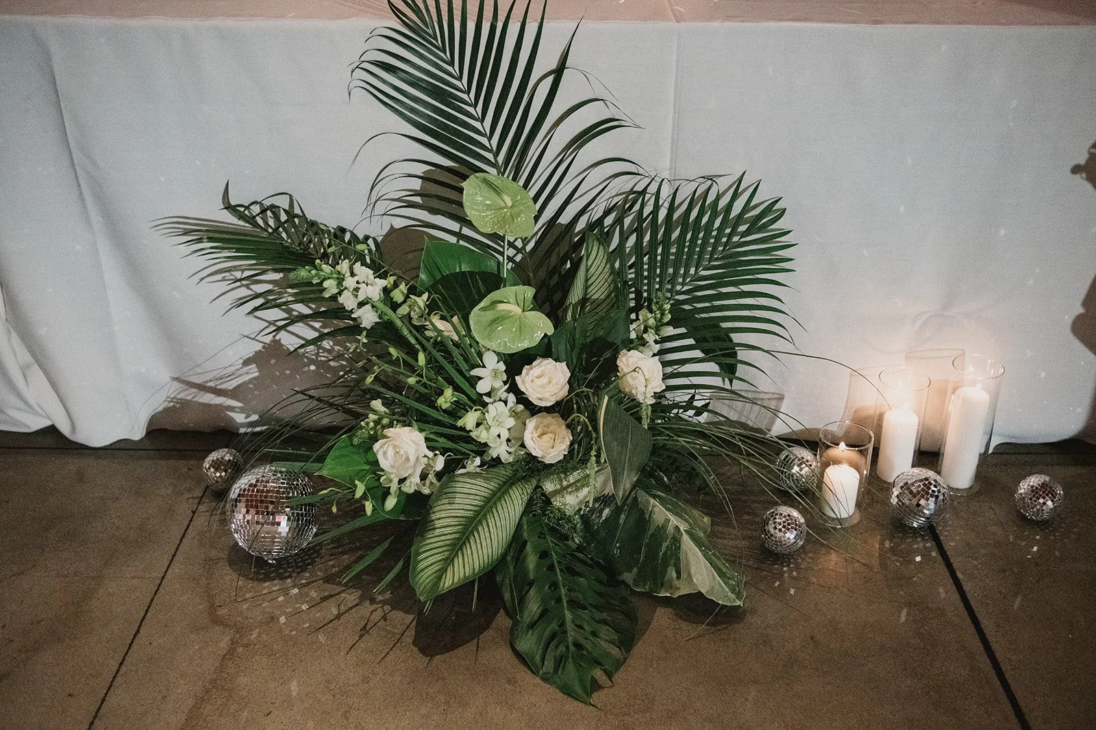 for Peter and Nolan, we created an urban jungle using modern green and white tropical flowers, metallic accents, and a custom hanging disco ball install. for ceremony, we set up a golden metal arch with tropical accents and attached palm leaf bouquets to the chairs to line the aisle.