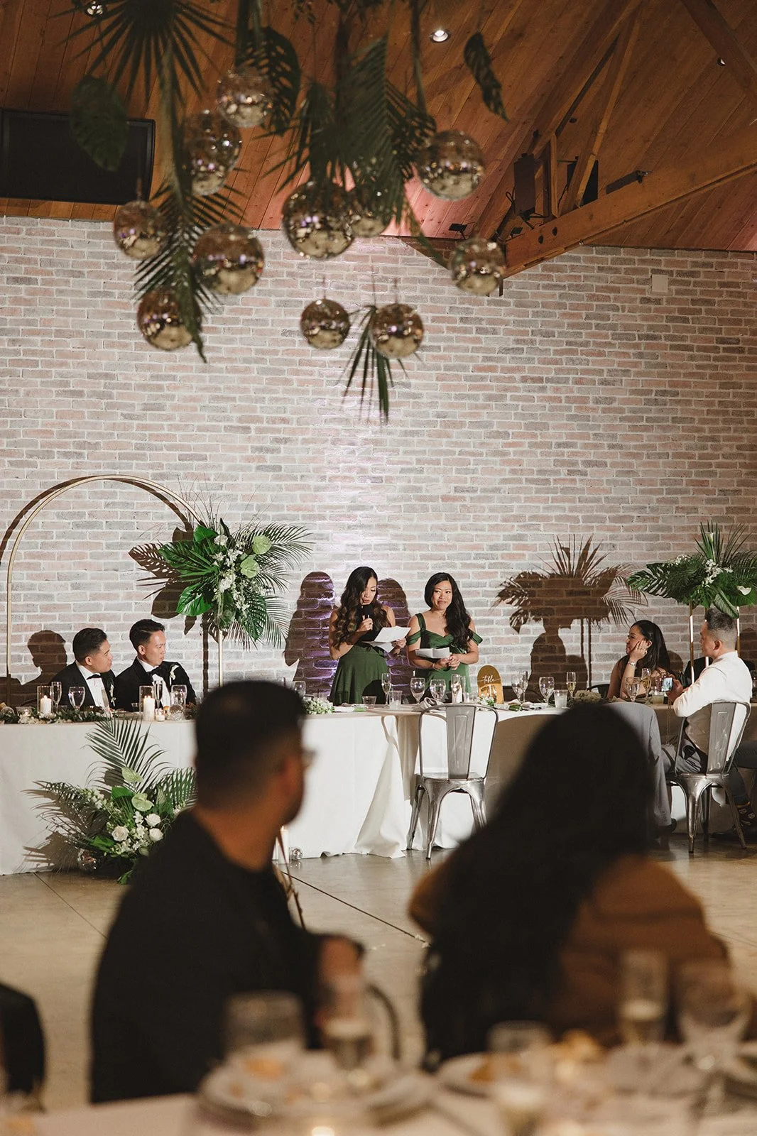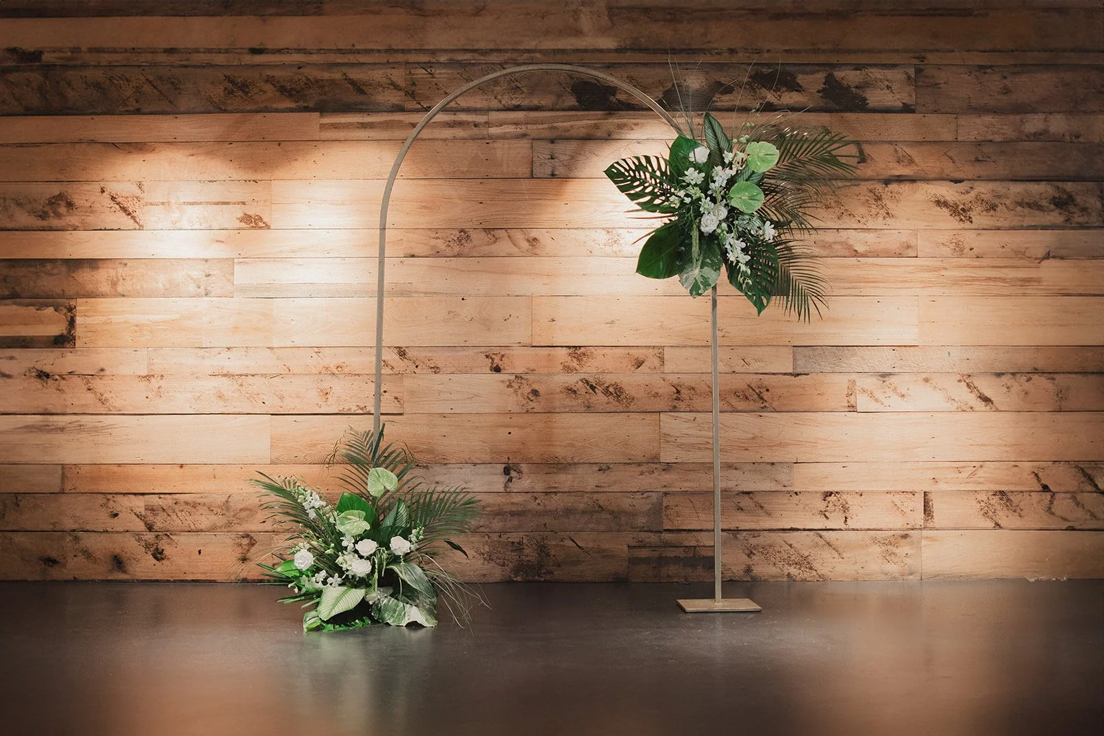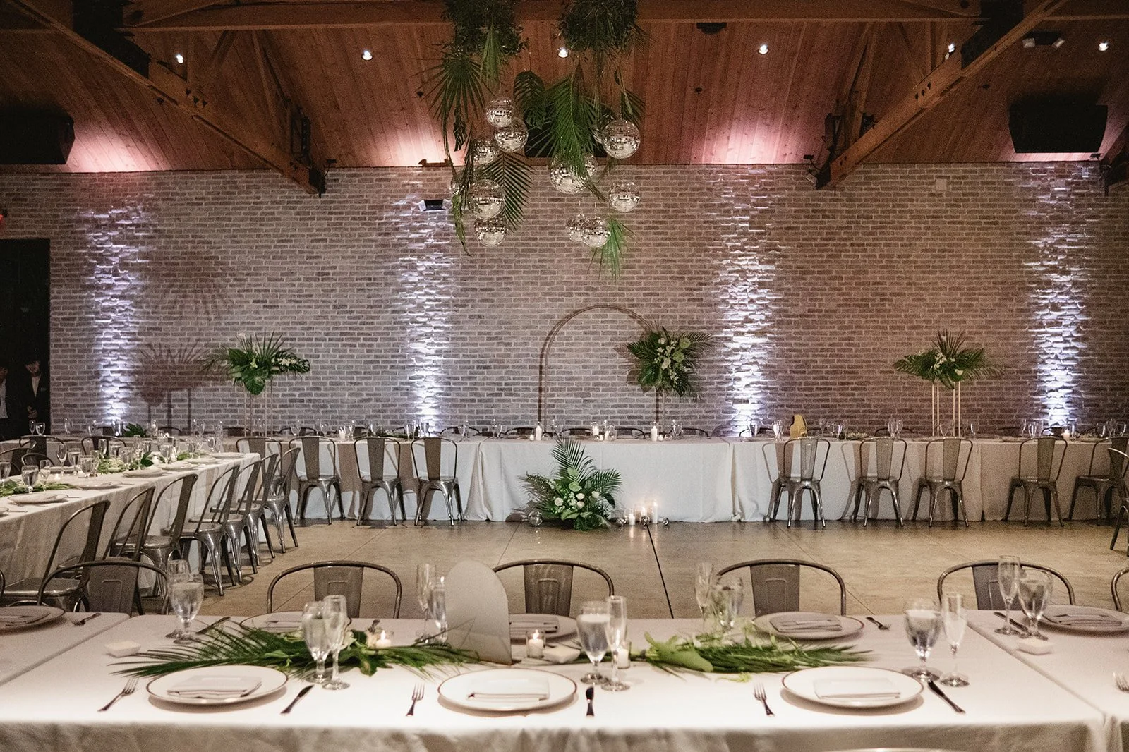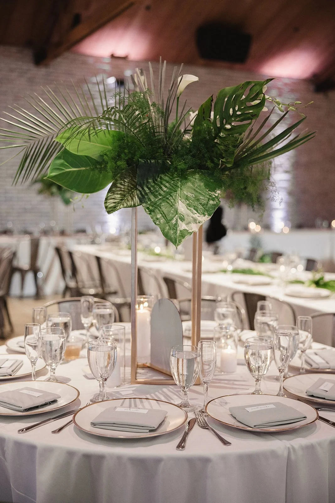 for Peter and Nolan, we created an urban jungle using modern green and white tropical flowers, metallic accents, and a custom hanging disco ball install. for ceremony, we set up a golden metal arch with tropical accents and attached palm leaf bouquets to the chairs to line the aisle.