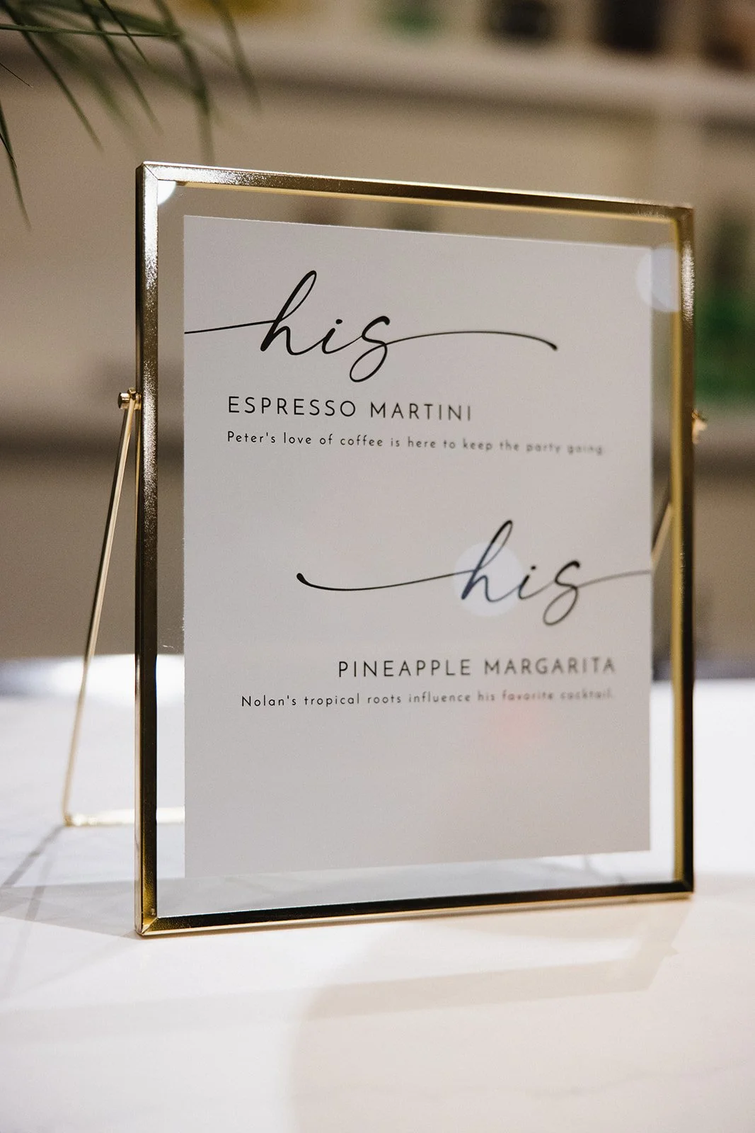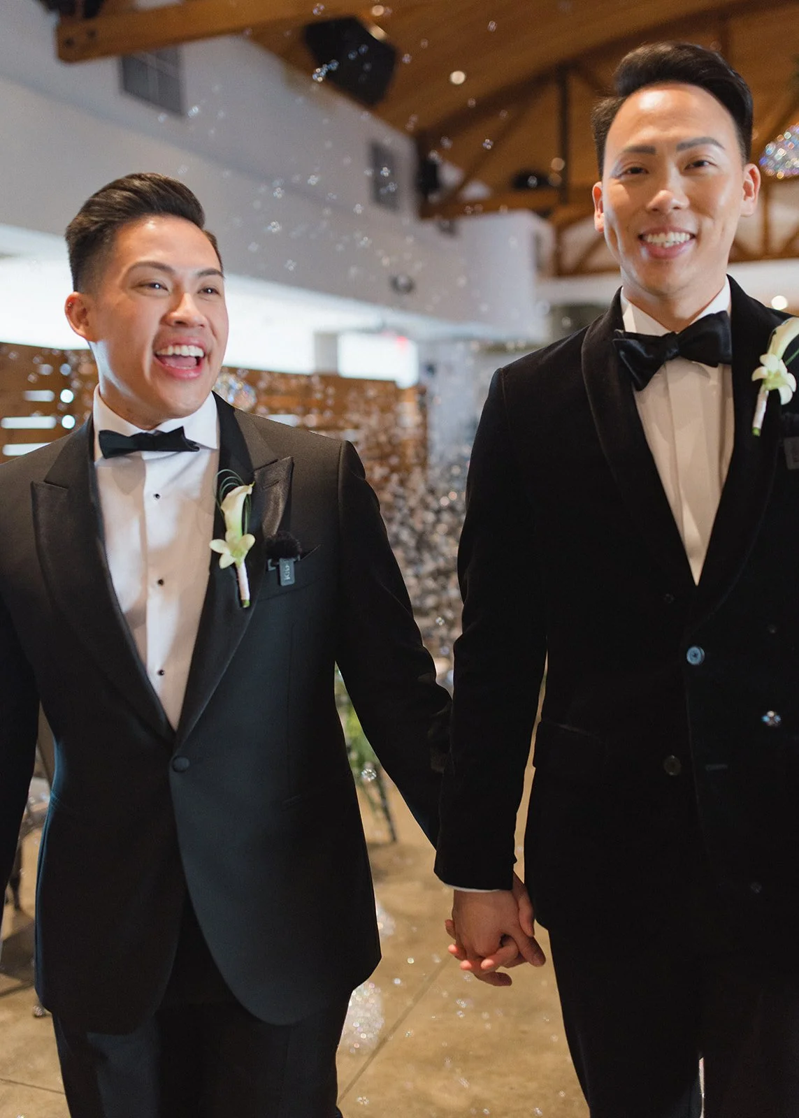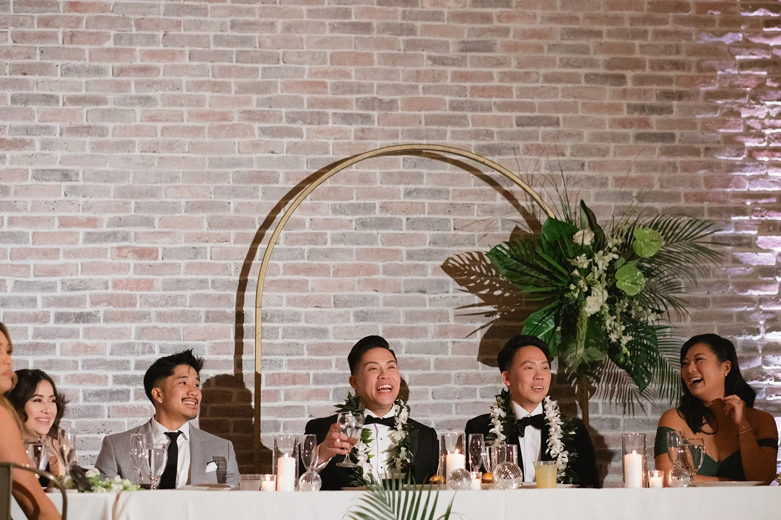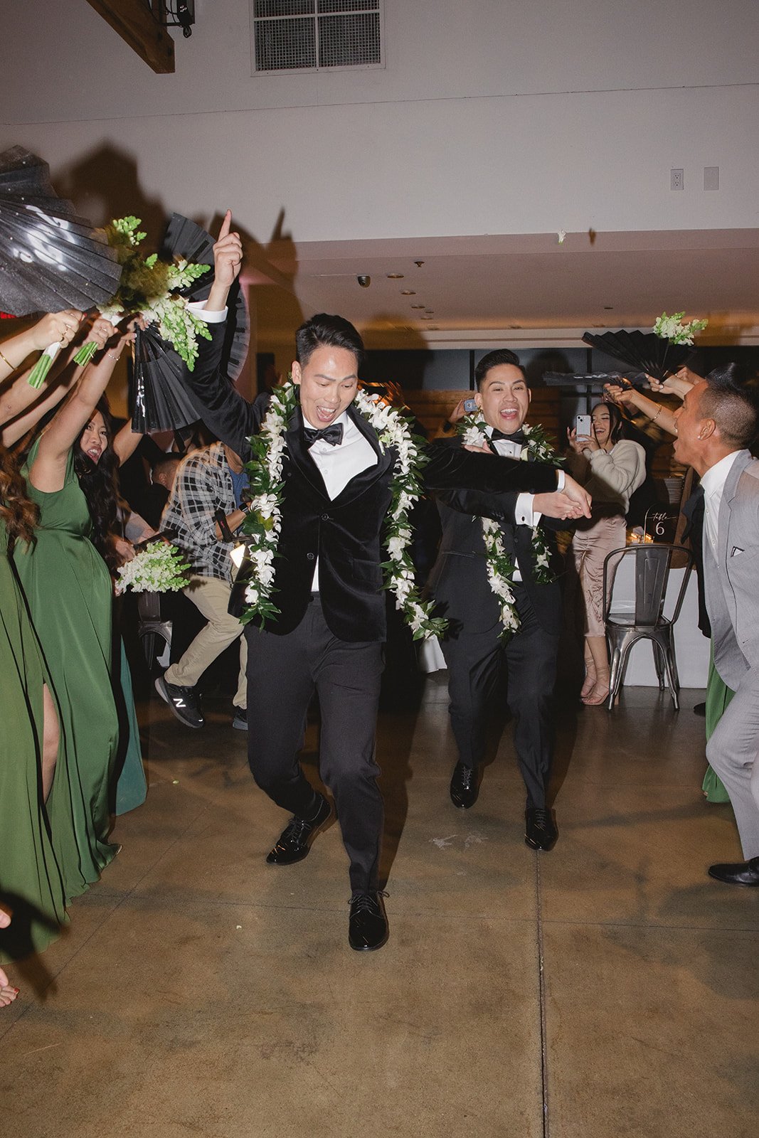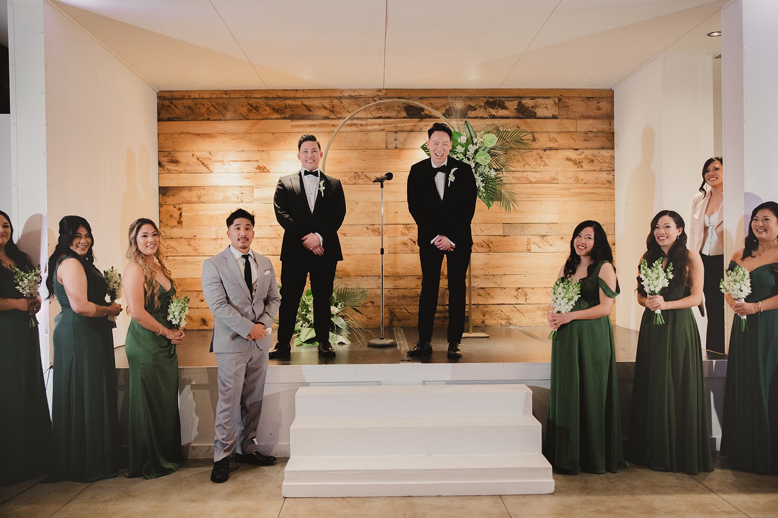 for Peter and Nolan, we created an urban jungle using modern green and white tropical flowers, metallic accents, and a custom hanging disco ball install. for ceremony, we set up a golden metal arch with tropical accents and attached palm leaf bouquets to the chairs to line the aisle.