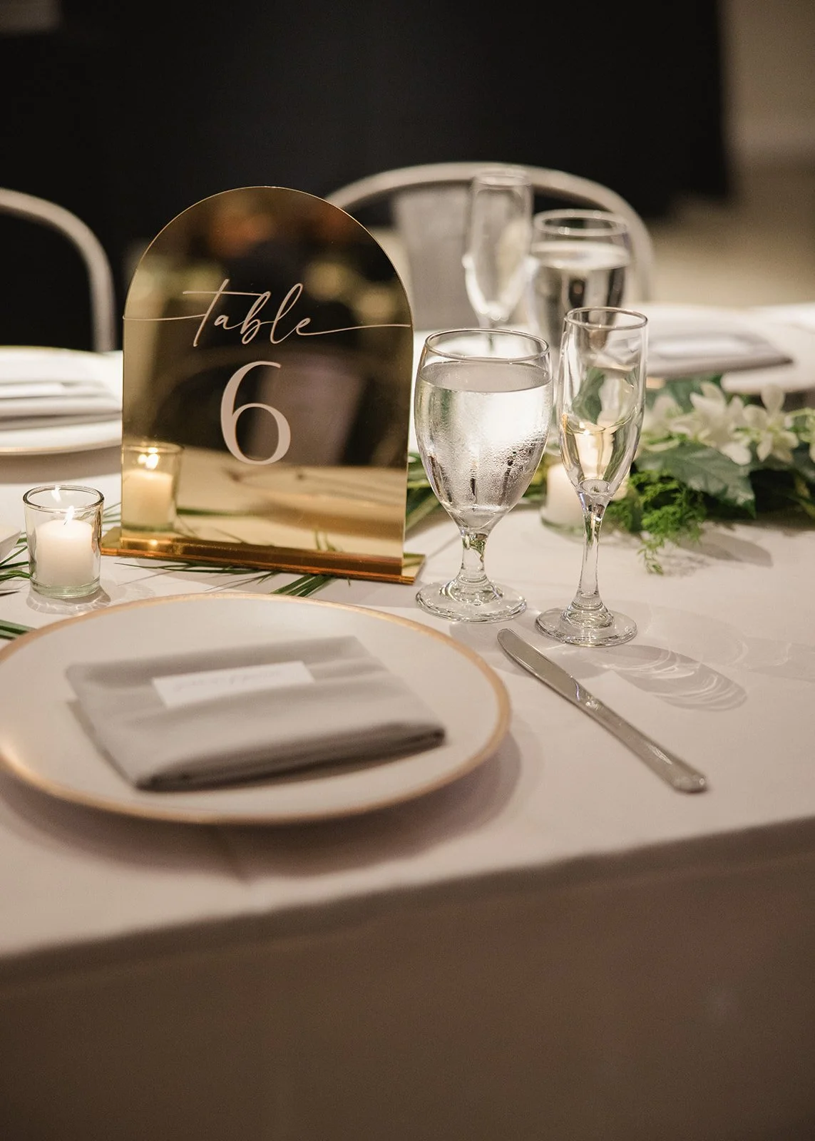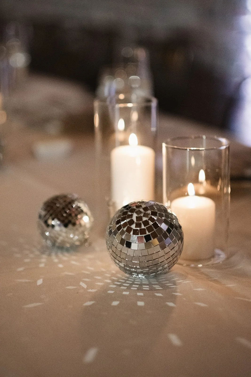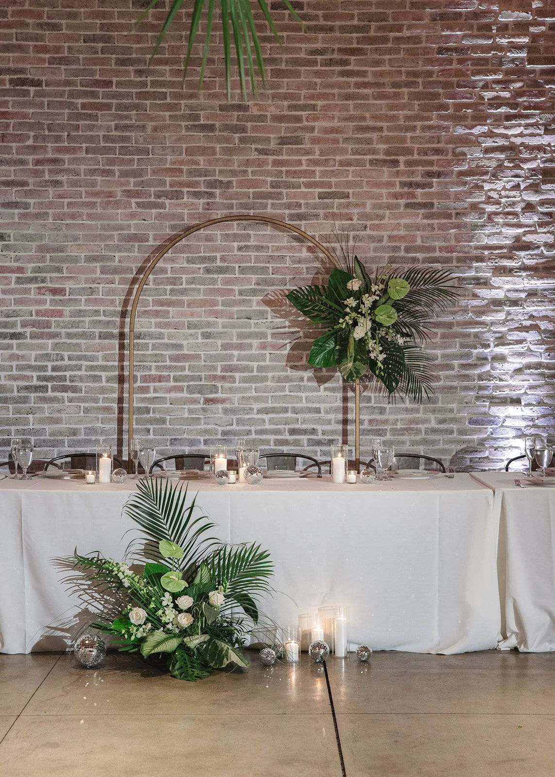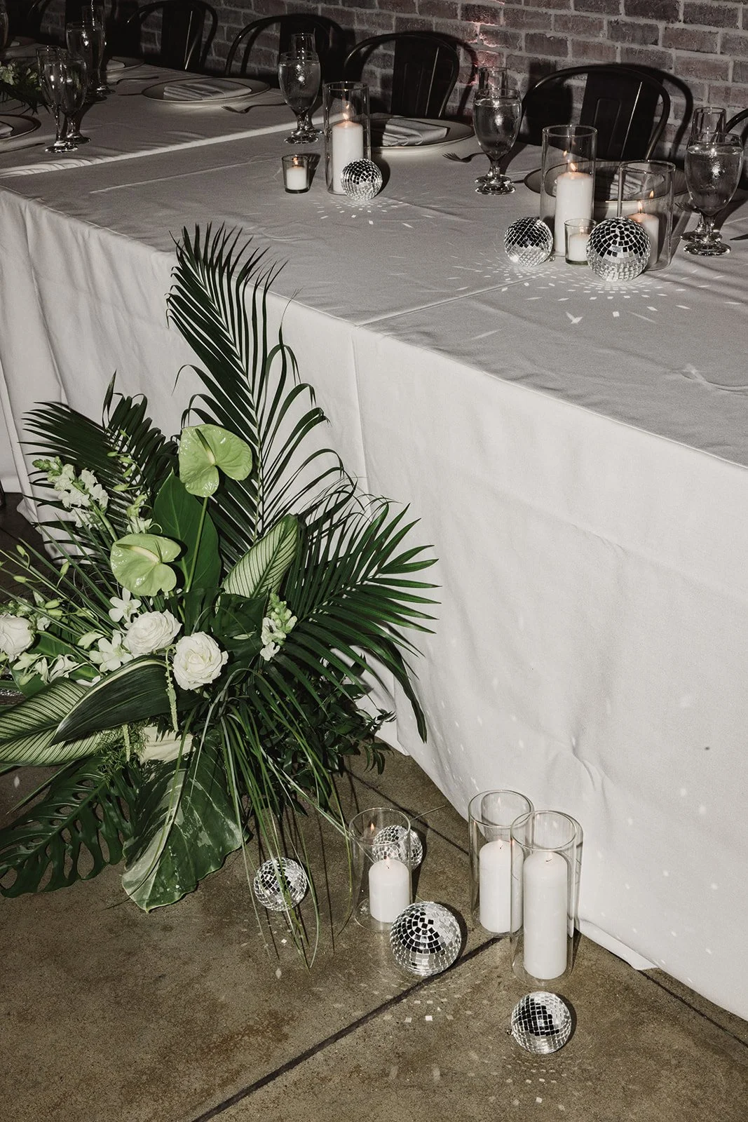 their reception tables had a combination of high-low florals to fully bring the room to life. tropical centerpieces on gold metal stands created height, and repurposed ceremony flowers decorated the sweetheart table with disco ball decor. the mood was lush, wintry, and bright.